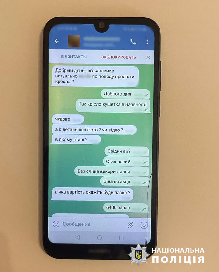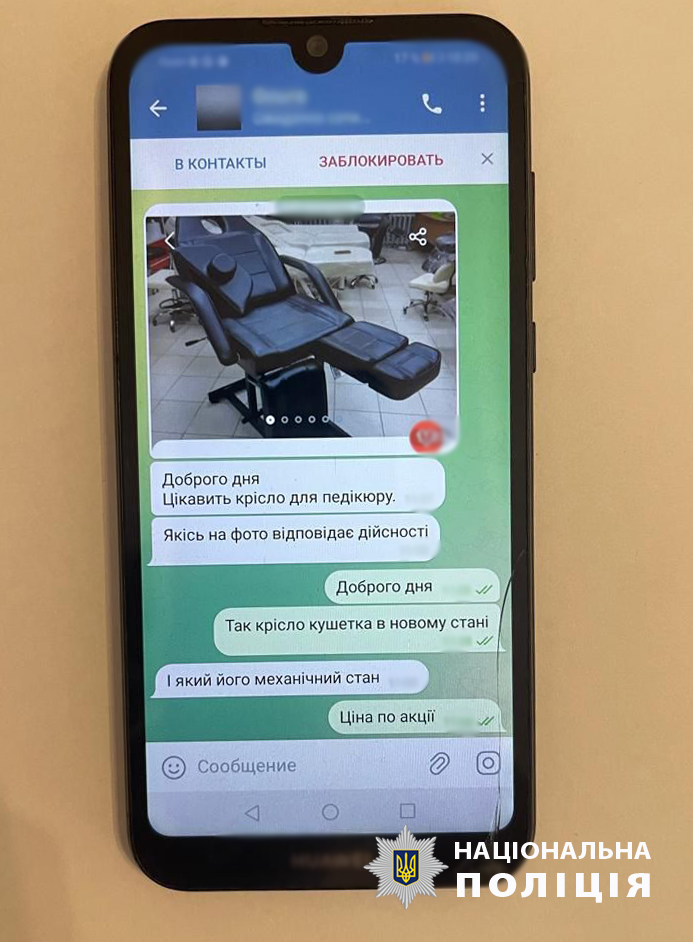 Протиправну діяльність одесита викрили співробітники відділу поліції № 2 Одеського районного управління поліції № 1. Правоохоронці встановили, що чоловік розмістив на одному із популярних сайтів оголошення про продаж крісла-кушетки для педикюру, якого насправді не мав, і вказав дуже привабливу ціну – 6400 гривень. Покупцям «продавець» висував умову: вишле поштою товар тільки після отримання передоплати в сумі половини його вартості.