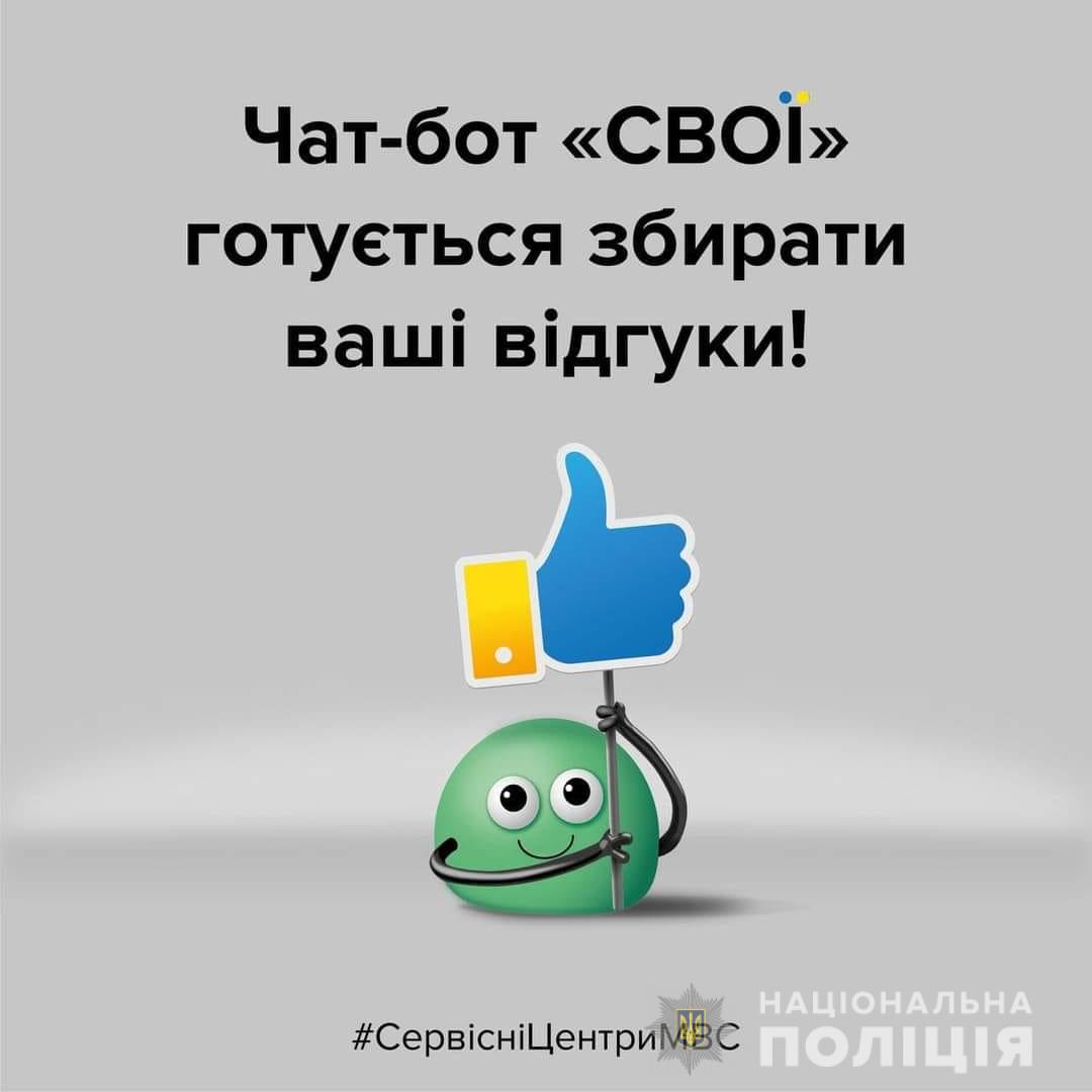Сервісні центри МВС запускають новий проєкт з оцінки надання послуг – чат-бот «СВОЇ». Він допоможе нам завдяки вашій зворотній реакції підвищити якість послуг.