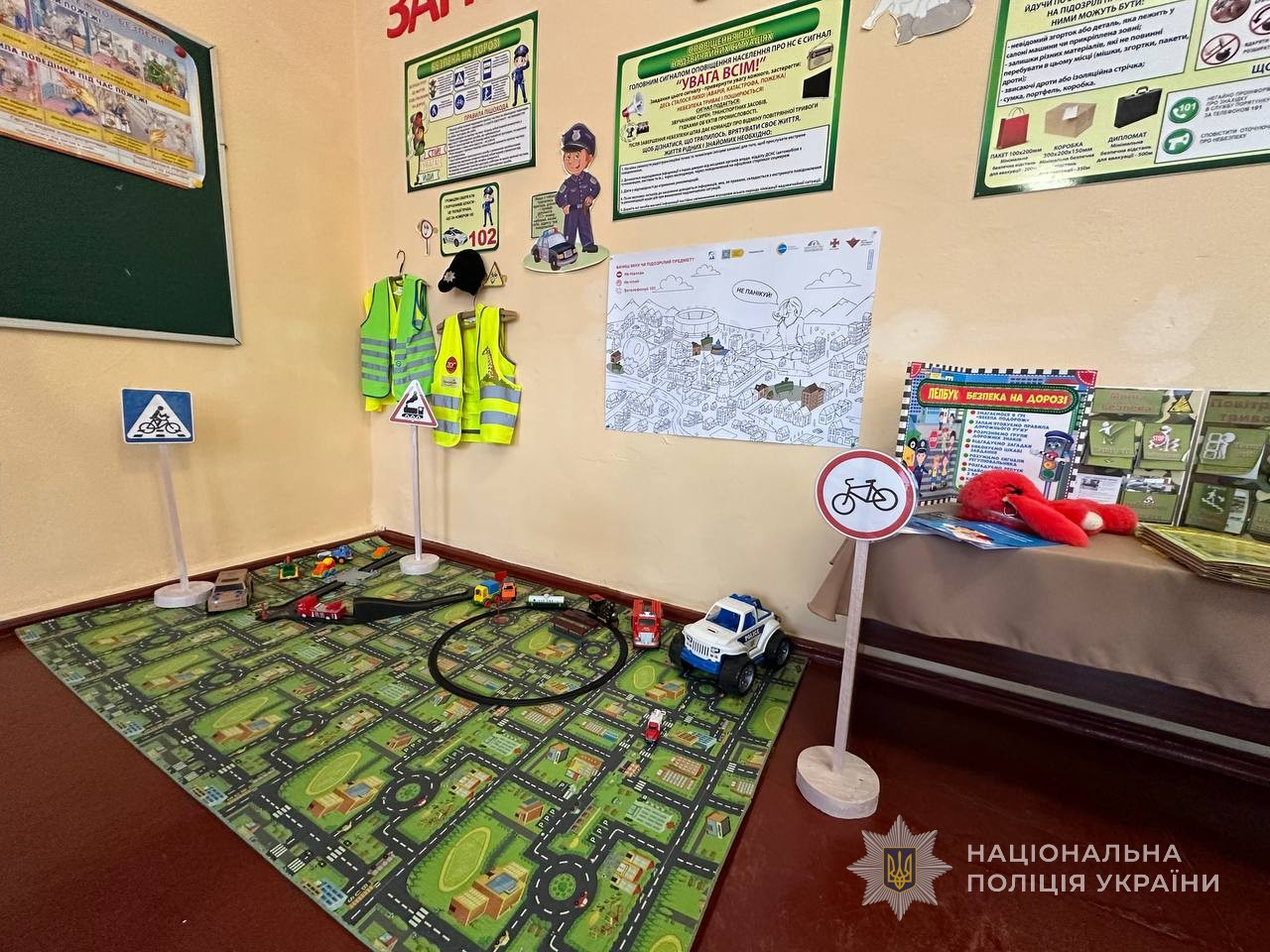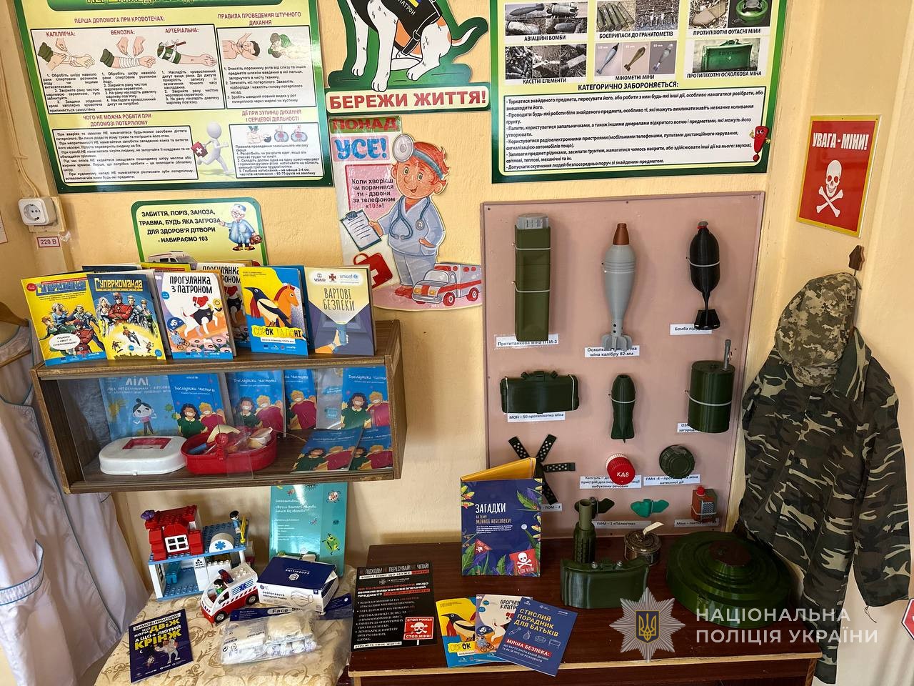 Педагоги розподілили клас на кілька тематичних зон, зокрема зони відпочинку, дорожньої, мінної та пожежної безпеки. В наявності наочна друкована продукція, макети вибухонебезпечних предметів, тематичні настільні ігри, розмальовки, відеопроєктор для перегляду навчальних стрічок.
