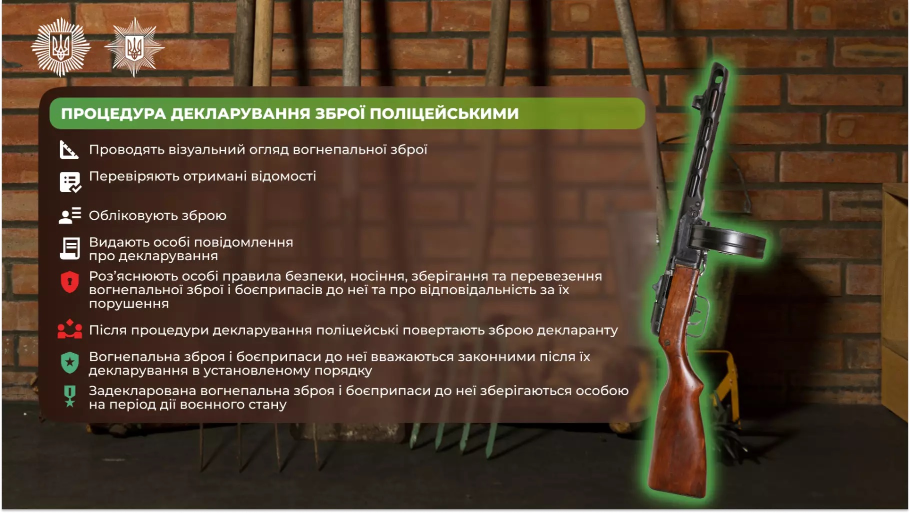 - Упродовж 24 годин прибути до найближчого підрозділу поліції за місцем Вашого перебування для декларування зброї або боєприпасів