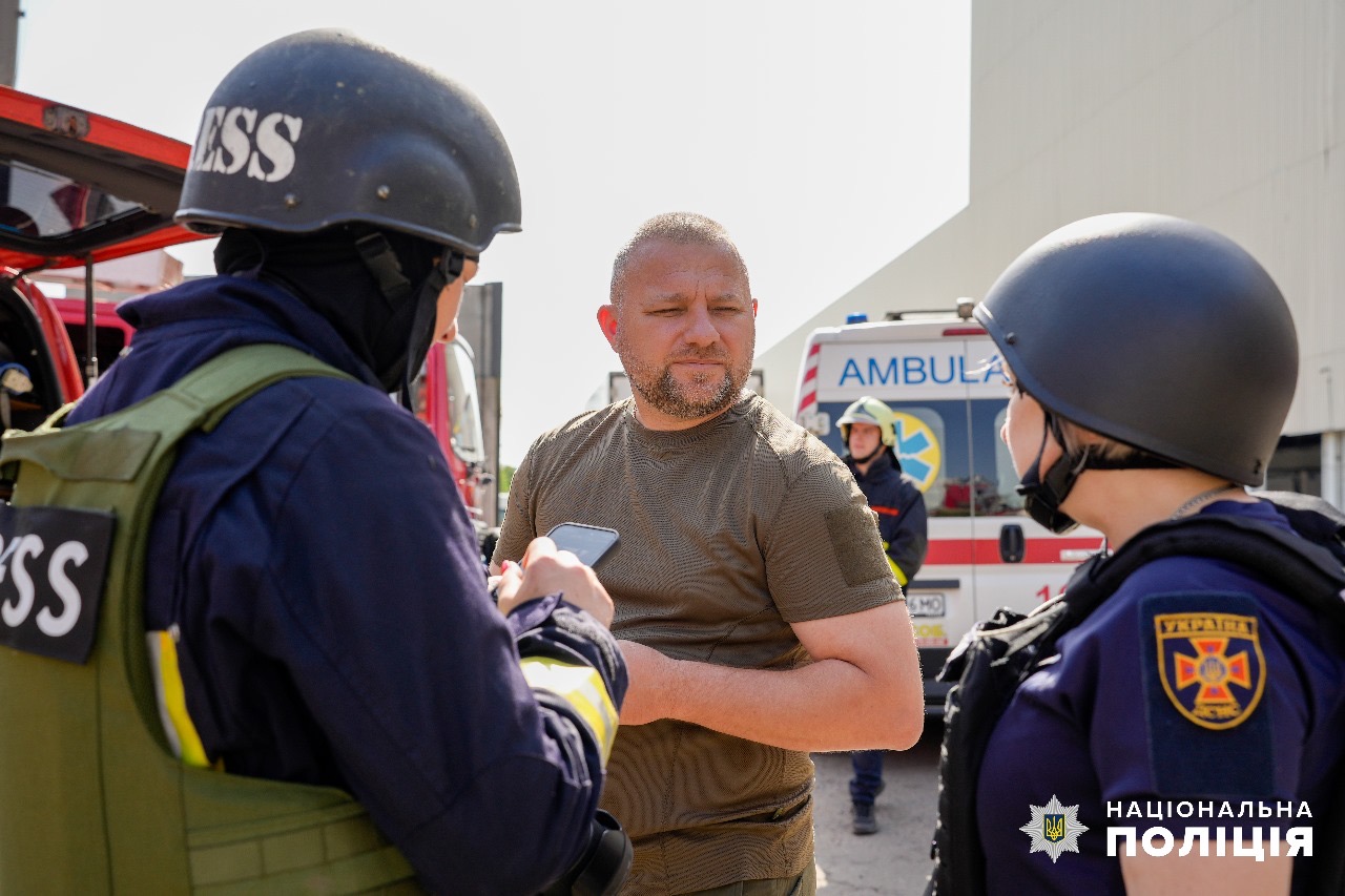 Поліцейські фіксують наслідки ворожої атаки, збирають докази воєнного злочину рф, опитують громадян, надають їм необхідну допомогу, забезпечують правопорядок та регулюють рух транспорту довкола.