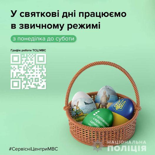 Любі наші українці, зовсім скоро Великодні свята! Проте у період воєнного стану сервісні центри МВС працюватимуть за звичним графіком - з понеділка до суботи.