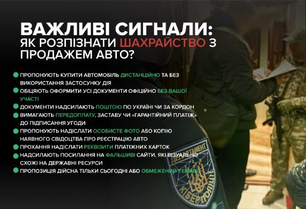 «Вигідна пропозиція купівлі-продажу авто тільки сьогодні. Угоду можна укласти онлайн, офіційно та за лічені хвилини, а документи надішлемо в будь-який куточок України чи світу». Обережно! Головний сервісний центр МВС разом із Департаментом кіберполіції Національної поліції України попереджають. Саме так часто виглядають оголошення із нібито вигідною пропозицією вдалої купівлі, під якою можуть маскуватися шахраї.