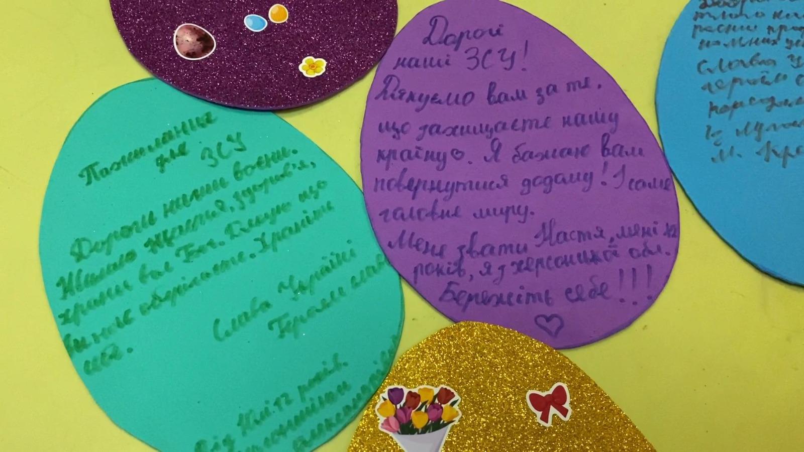 Поліцейські розповіли малечі про традиції святкування Великодня та долучили її до виготовлення аплікацій у вигляді писанок, на яких вони написали зворушливі привітання військовослужбовцям. Дітки побажали нашим відважним та незламним захисникам скорішої перемоги та якнайшвидшого повернення додому. Це – найбільше бажання, яке вони мають нині, адже їм самим так хочеться повернутися до рідних домівок на Харківщину, Донеччину, Херсонщину та Миколаївщину.