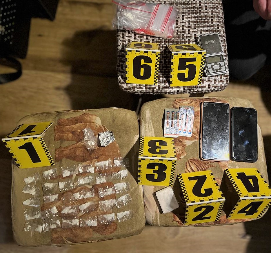З їхніх осель поліцейські вилучили порошкоподібну речовину білого кольору, речовину рослинного походження зеленого кольору, порошкоподібну речовину рожевого кольору, метадон, амфетамін, приладдя для фасування наркотиків та гроші, отримані з незаконної діяльності. Належність частини вилученої речовини до наркотичної підтвердили за допомогою експрес-дослідження.