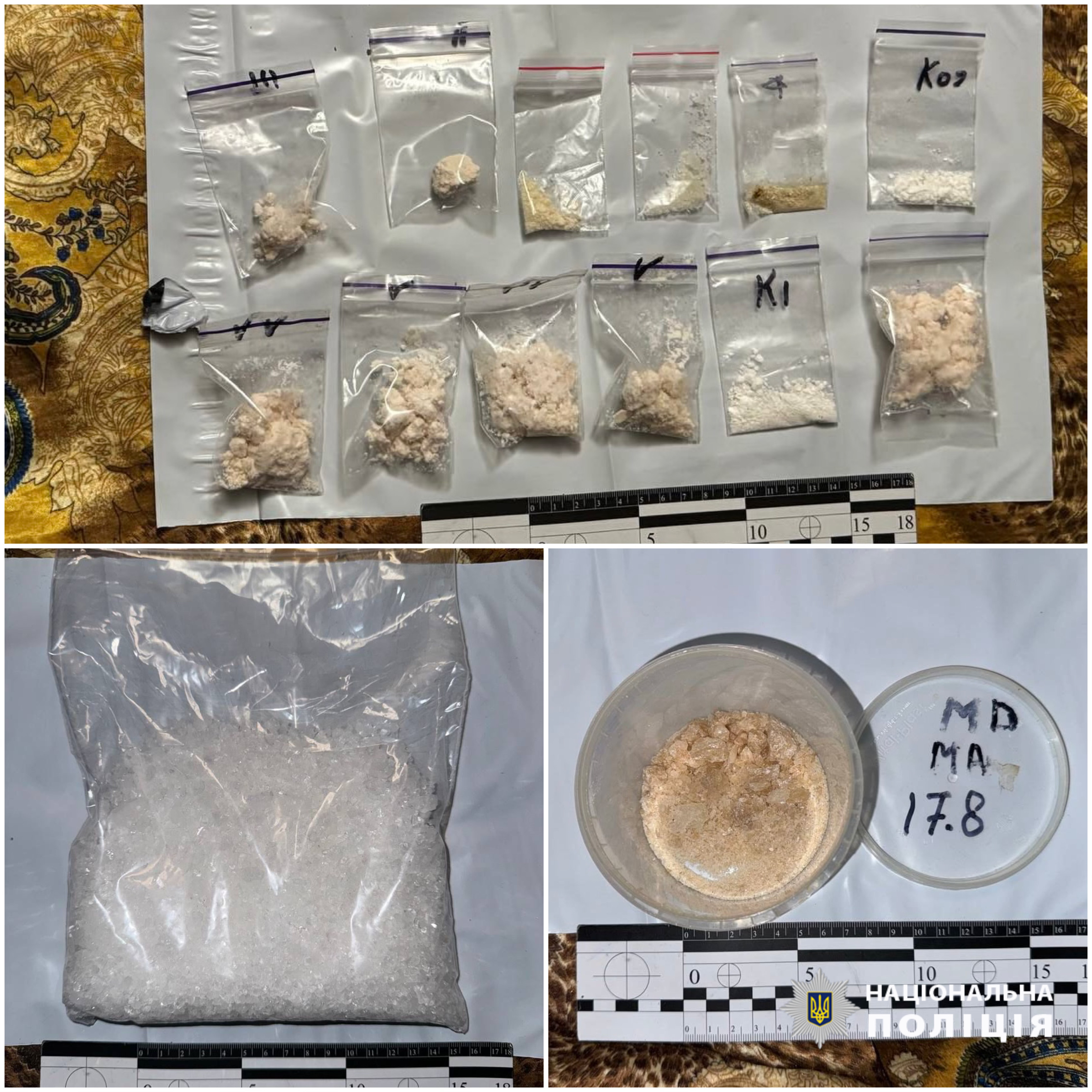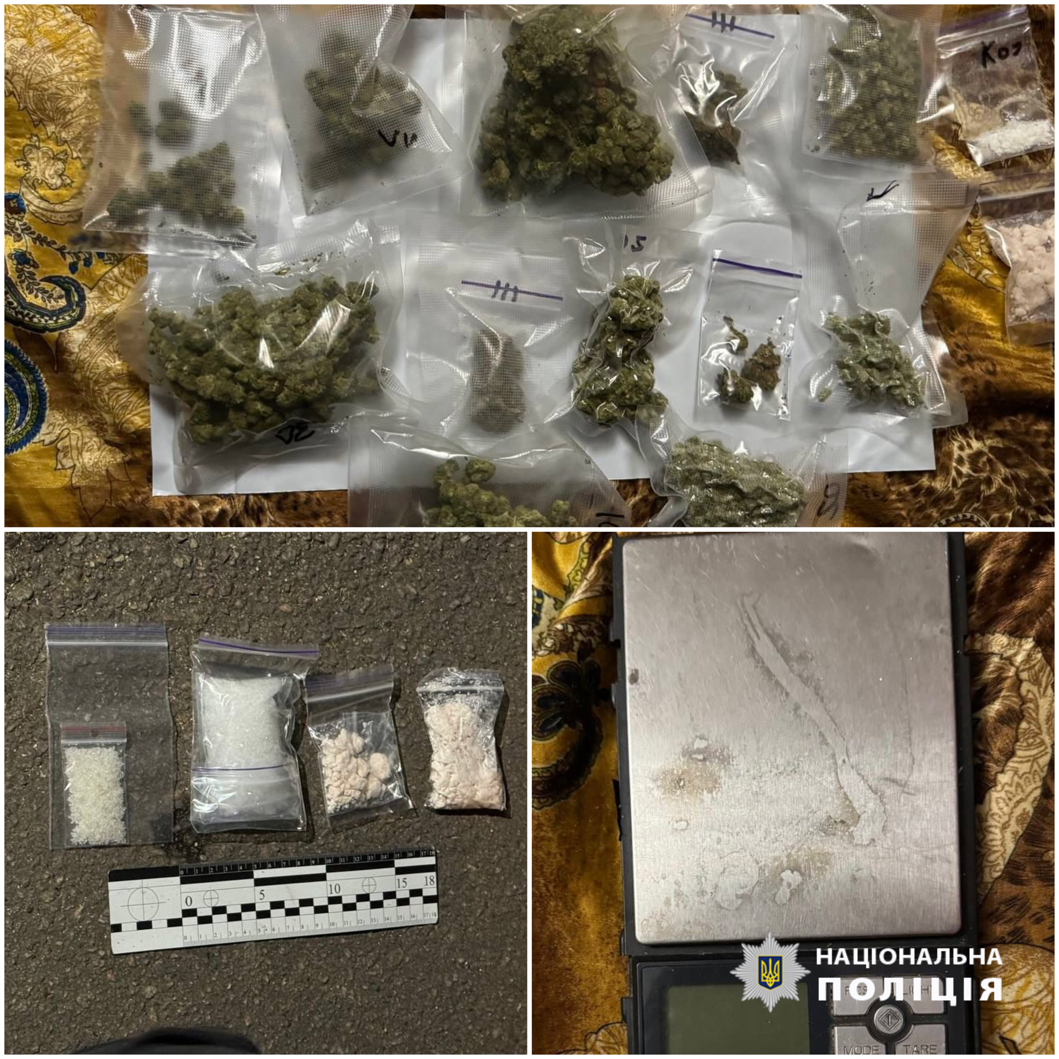 Під час невідкладного обшуку за місцем мешкання зловмисника слідчі вилучили ще низку різних речовин синтетичного та рослинного походження, схожих на так звані «солі», МДМА, канабіс, а також пакульвальний матеріал, електронні ваги та мобільні телефони фігуранта.