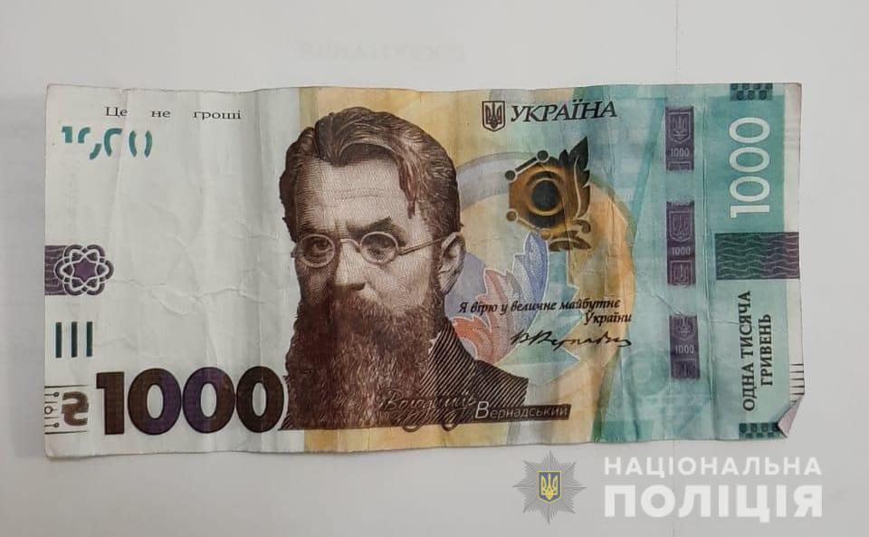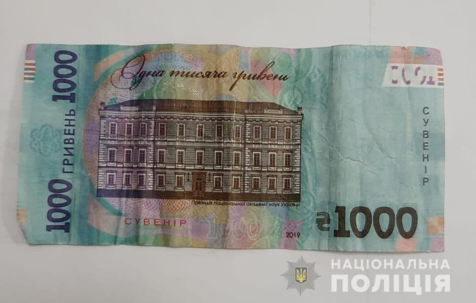 Зловмисник розрахувався з водієм сувенірною купюрою номіналом 1000 гривень і отримав від нього 860 гривень решти. Коли ж потерпілий розгледів фальшивку й попросив чоловіка повернути гроші, той просто вибіг з чужою готівкою з авта.