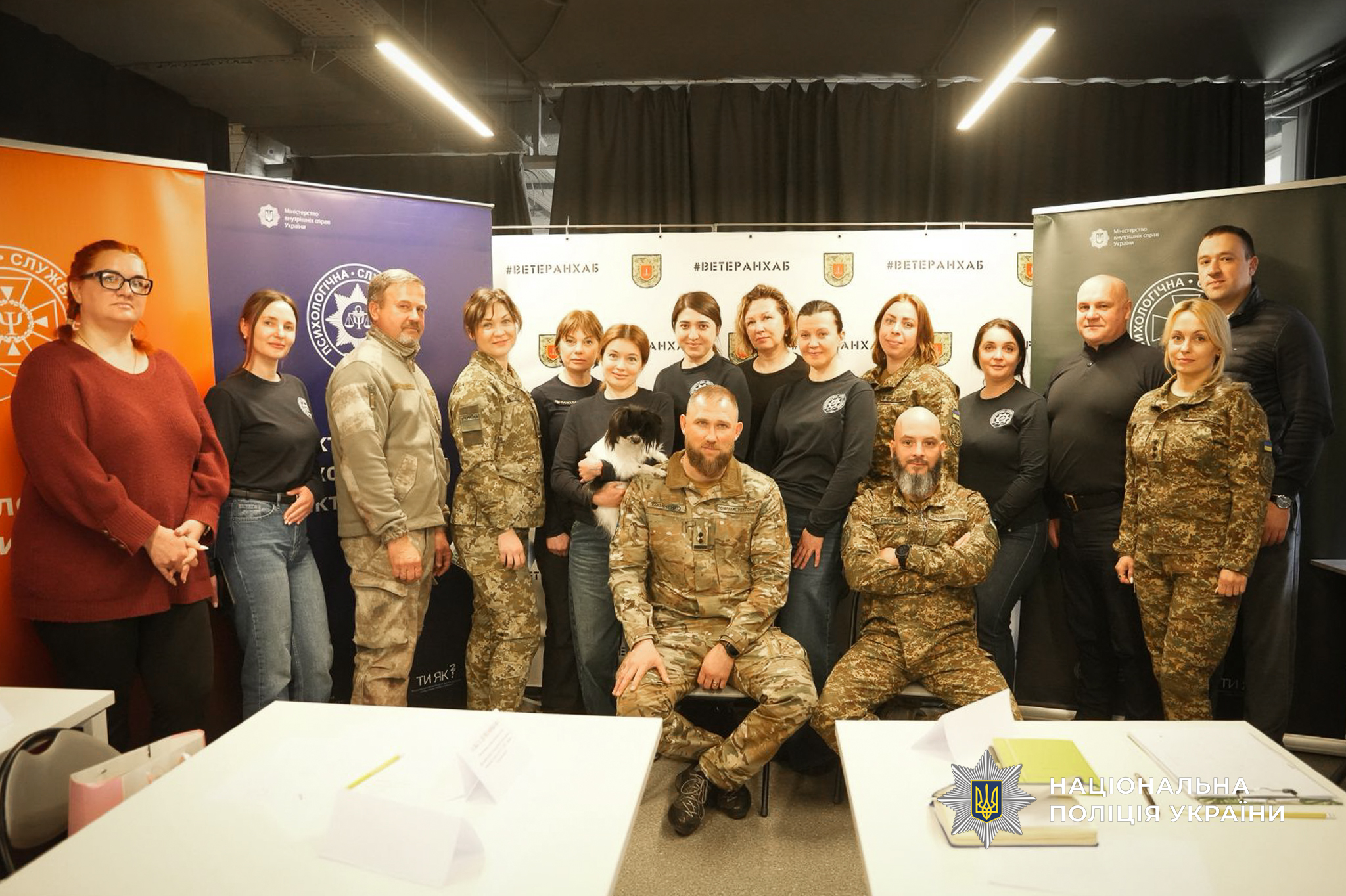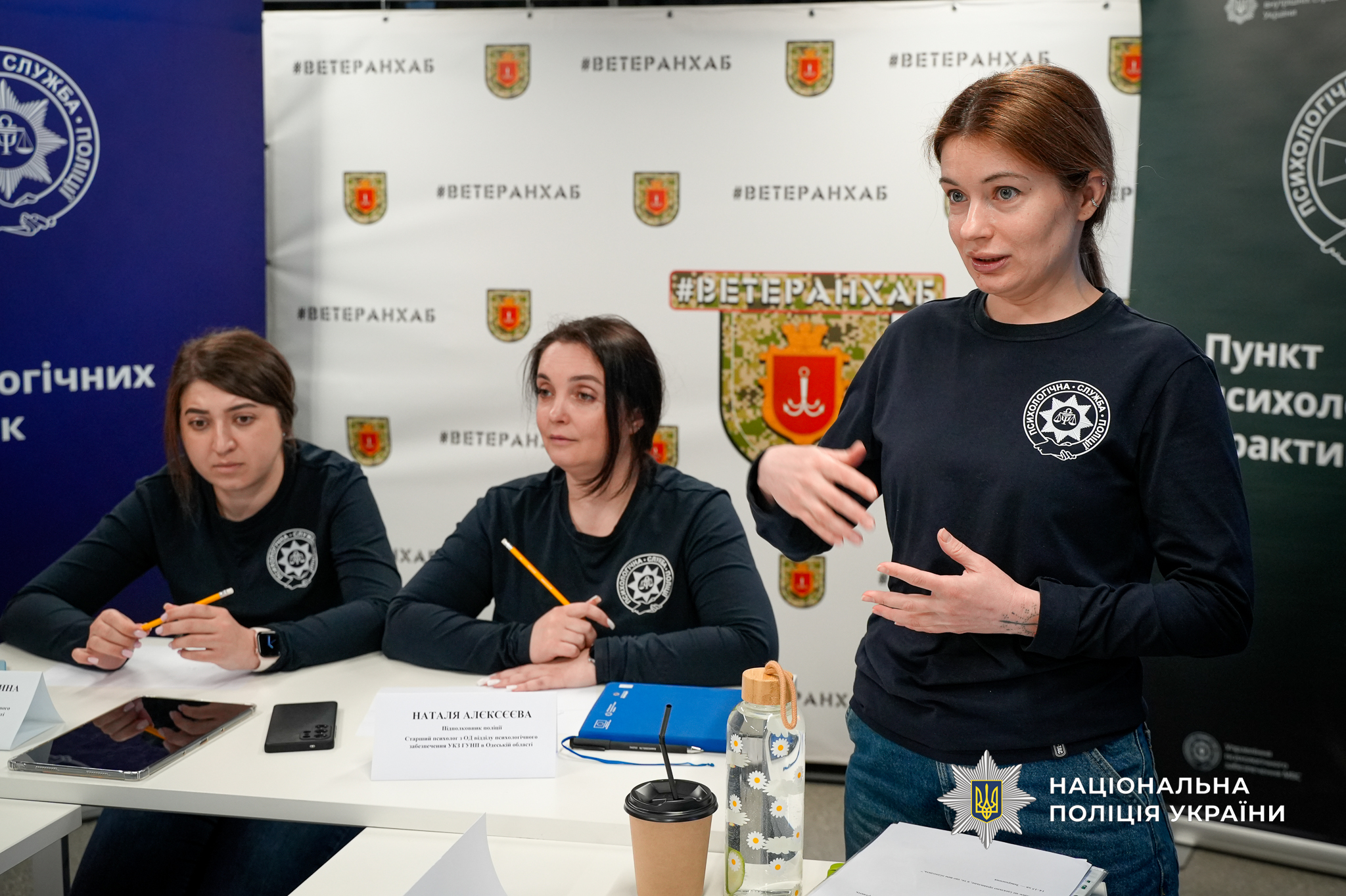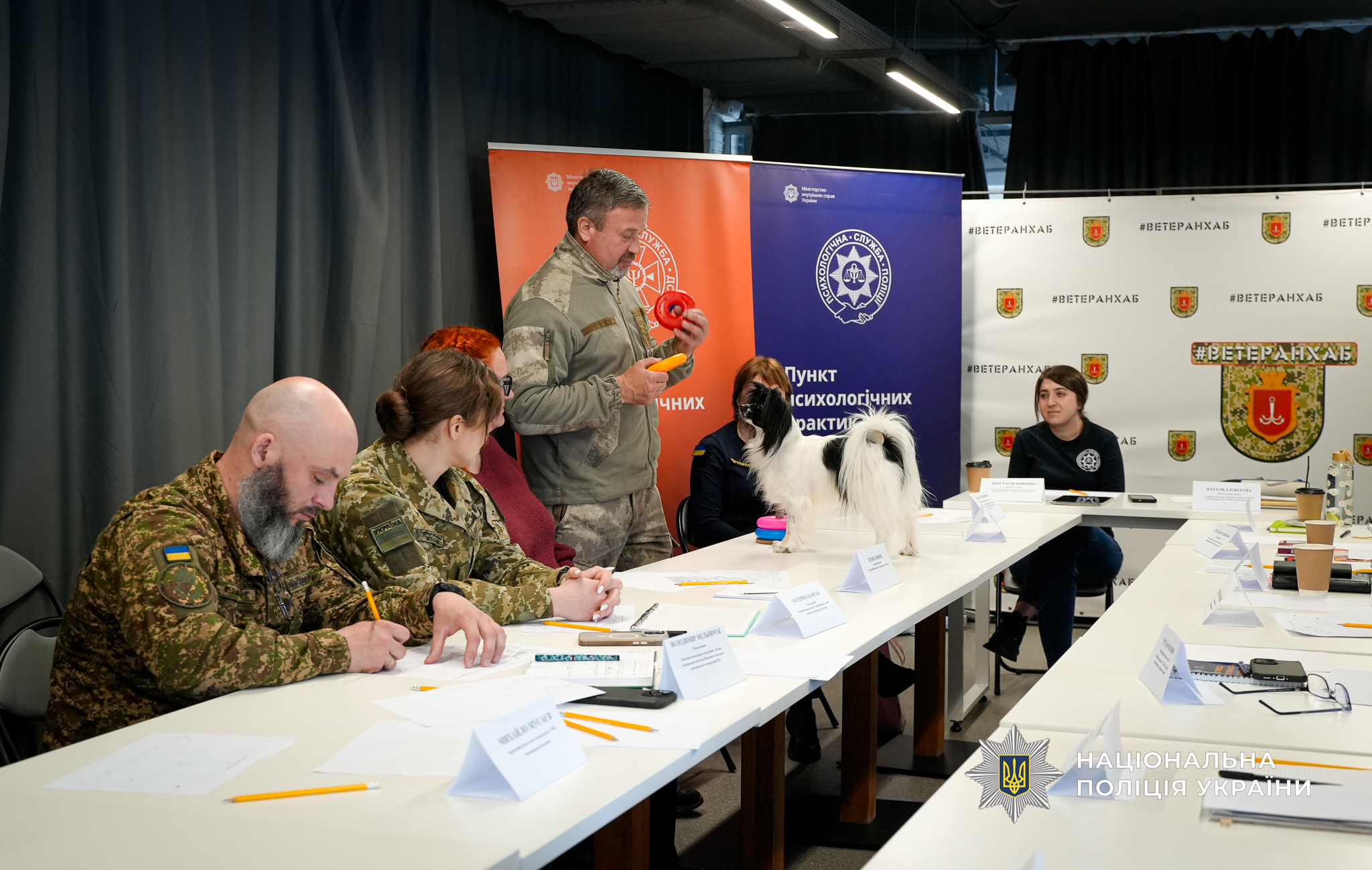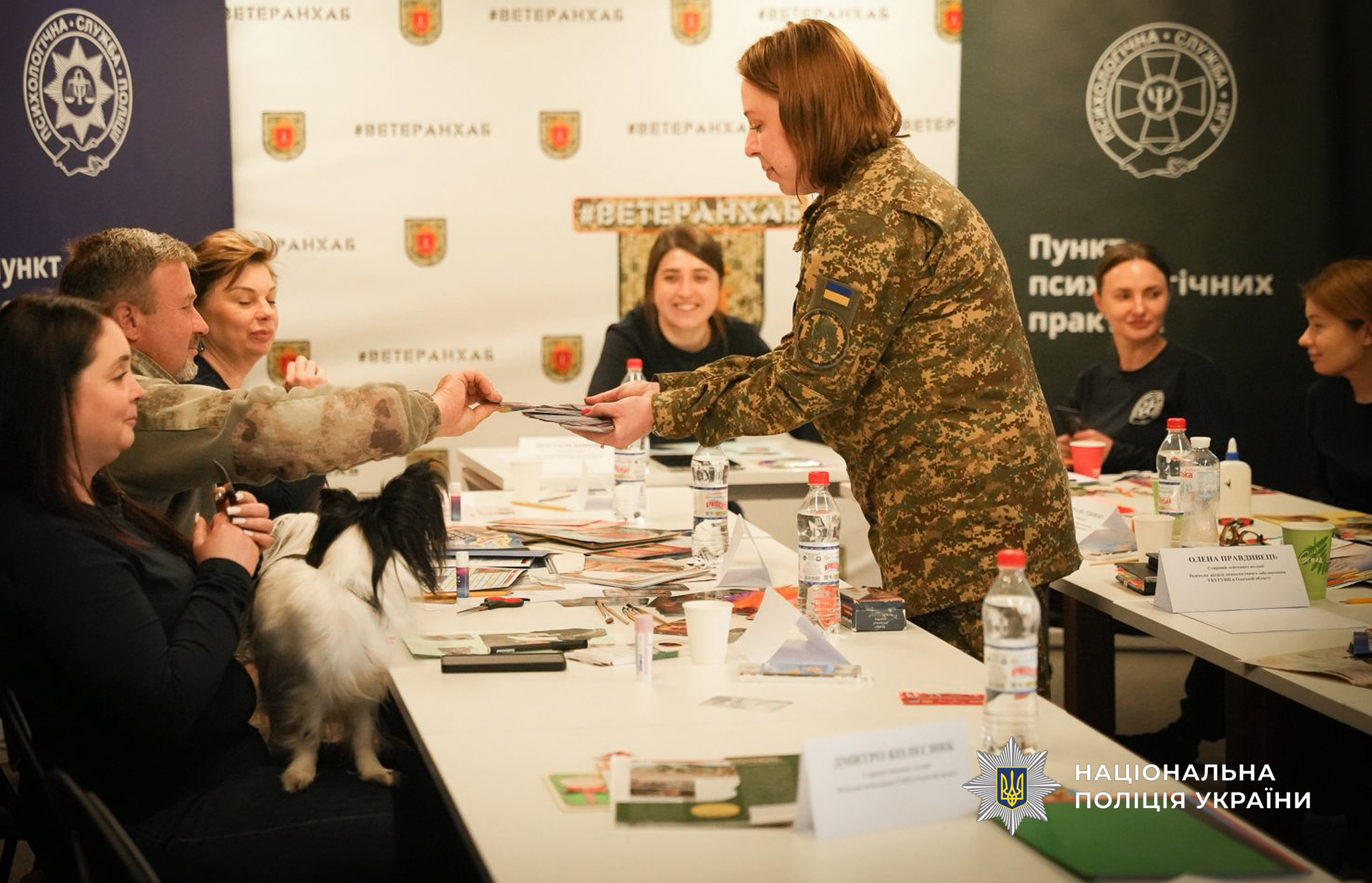На захід психологи запросили і представників ветеранів, яких залучили до його практичної частини. Зокрема, від поліції були помічник начальника ГУНП в Одеській області з питань ветеранської політики Дмитро Колесник та провідний консультант Михайло Мусаєв. Вони опановували елементи музикотерапії, працювали через малювання як спосіб емоційного вираження та відновлення, спостерігали, як працюють фахівці з каністерапії – сертифіковані спеціалісти та кінологи, що проводять заняття із залученням спеціально підготовлених собак. Такий підхід сприяє зниженню рівня тривожності, покращенню емоційного стану та відновленню внутрішніх ресурсів.