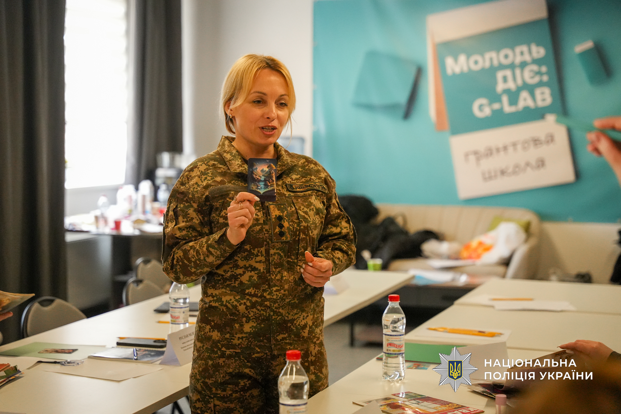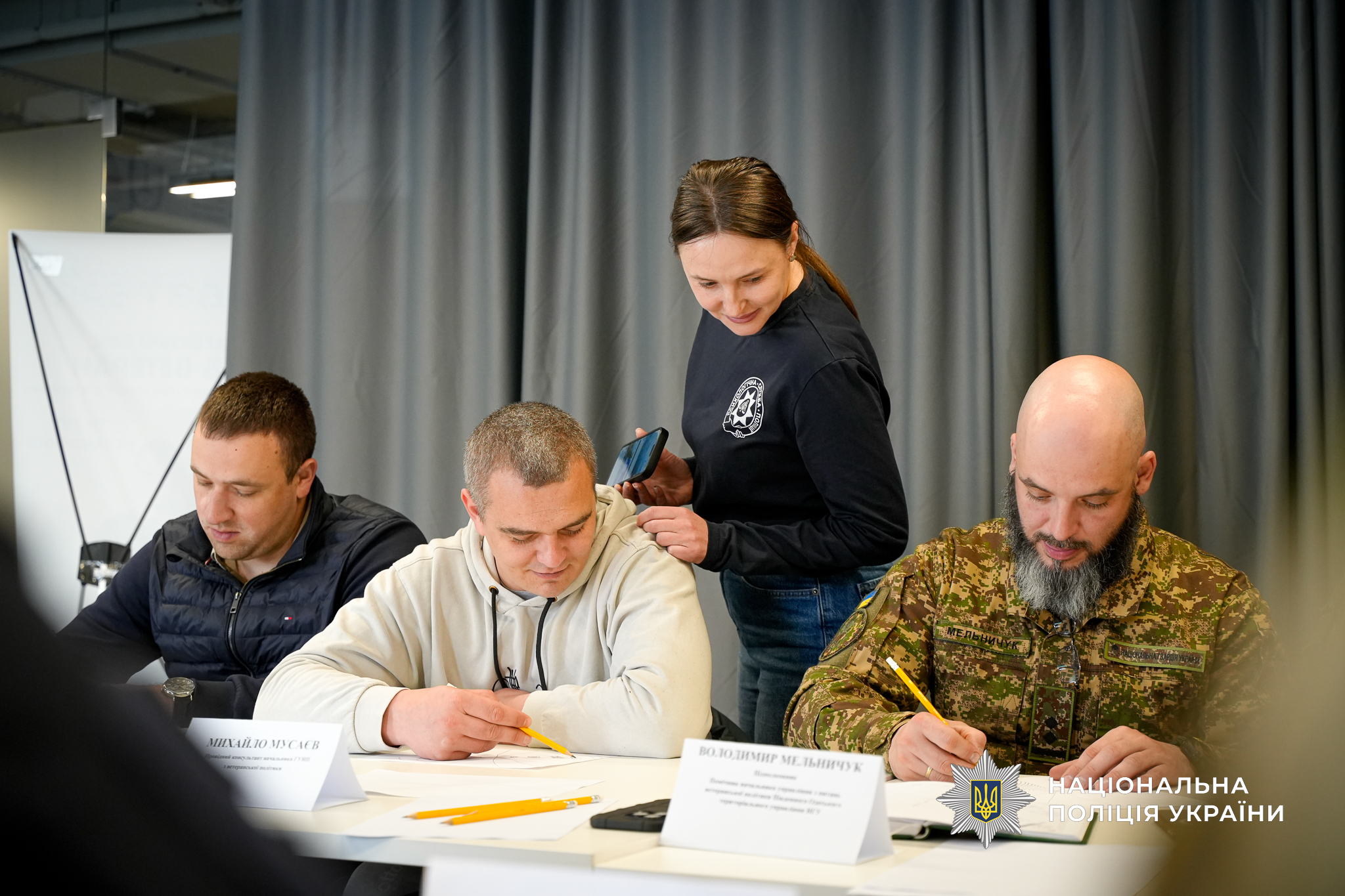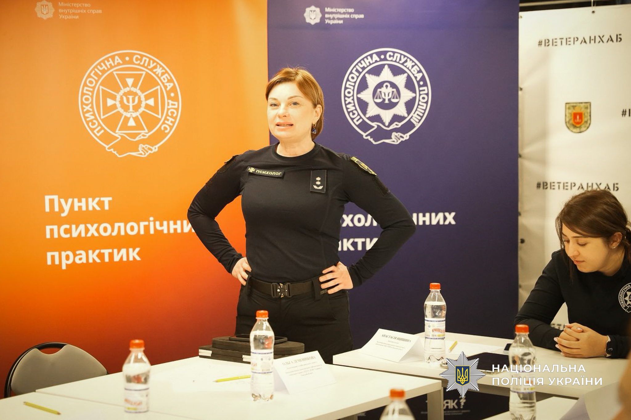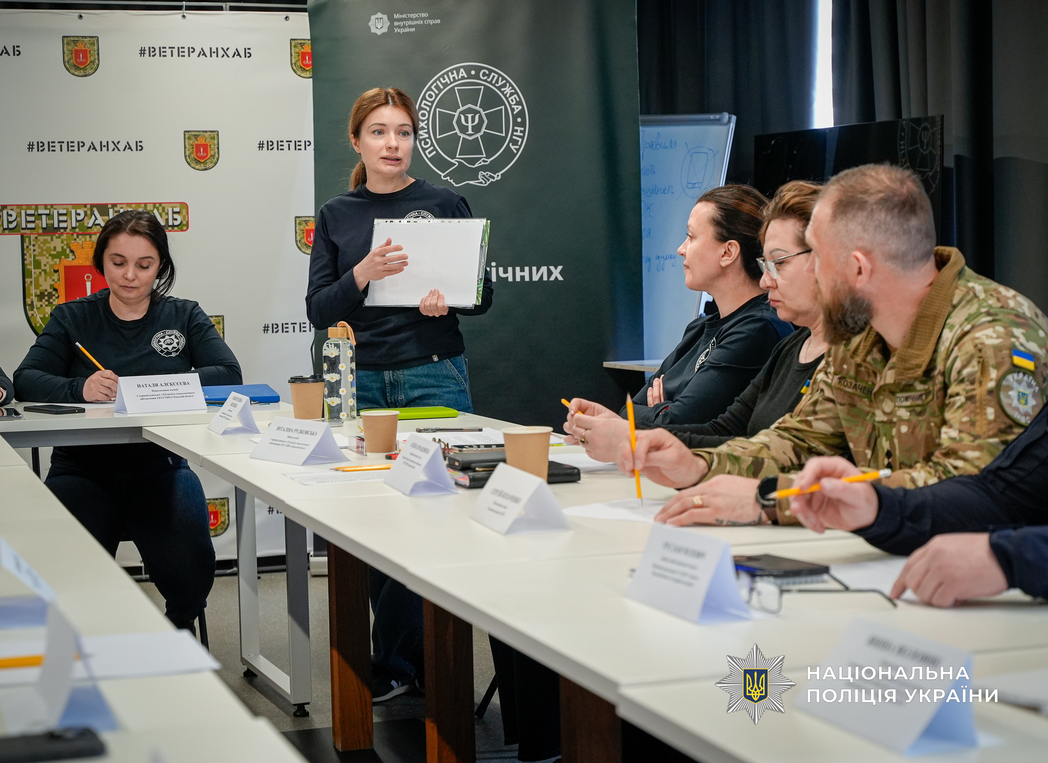 На захід психологи запросили і представників ветеранів, яких залучили до його практичної частини. Зокрема, від поліції були помічник начальника ГУНП в Одеській області з питань ветеранської політики Дмитро Колесник та провідний консультант Михайло Мусаєв. Вони опановували елементи музикотерапії, працювали через малювання як спосіб емоційного вираження та відновлення, спостерігали, як працюють фахівці з каністерапії – сертифіковані спеціалісти та кінологи, що проводять заняття із залученням спеціально підготовлених собак. Такий підхід сприяє зниженню рівня тривожності, покращенню емоційного стану та відновленню внутрішніх ресурсів.