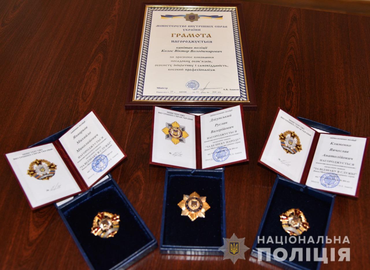 За зразкове виконання службового обов’язку, високий професіоналізм, ініціативу та відданість присязі нагрудними знаками «За відзнаку в службі», «За безпеку народу» та грамотою відзначили Руслана Дзігунського, Вячеслава Клименка, Віктора Колоса та Михайла Январьова.