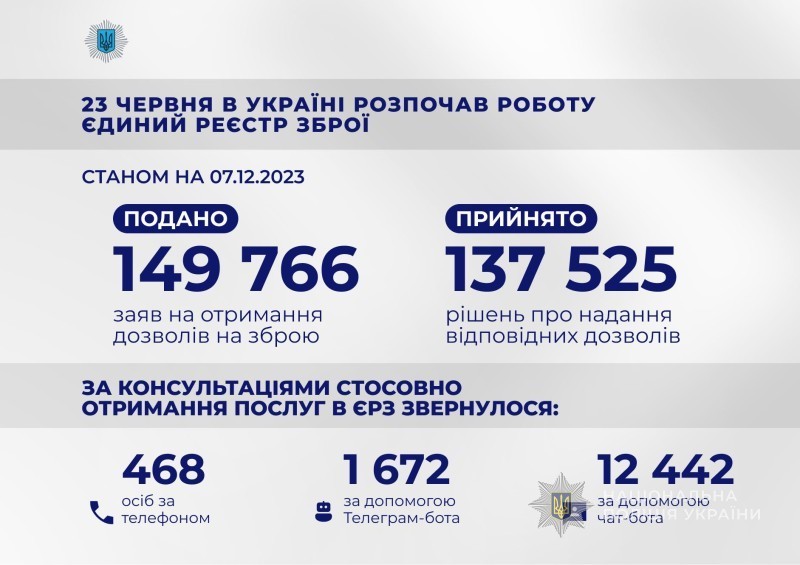 Від 23 червня в Україні працює реєстр зброї, відтоді отримано понад 149 тис. заяв від громадян на отримання різних видів дозволів на зброю.