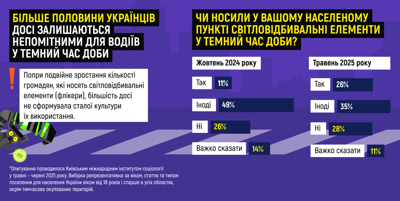 За даними Всеукраїнського опитування «Думки і погляди населення України» (Омнібус), проведеного Київським міжнародним інститутом соціології у травні 2025 року, третина українців досі залишаються малопомітними на дорозі в темну пору доби взимку. Так, минулої зими лише 26% українців регулярно користувалися світловідбивальними елементами. У жовтні 2024 р., за результатами аналогічного опитування соціологічної групи «Рейтинг», регулярне використання становило лише 11% — показник помітно зріс зокрема і на тлі спільних інформаційних зусиль державних і міжнародних партнерів.