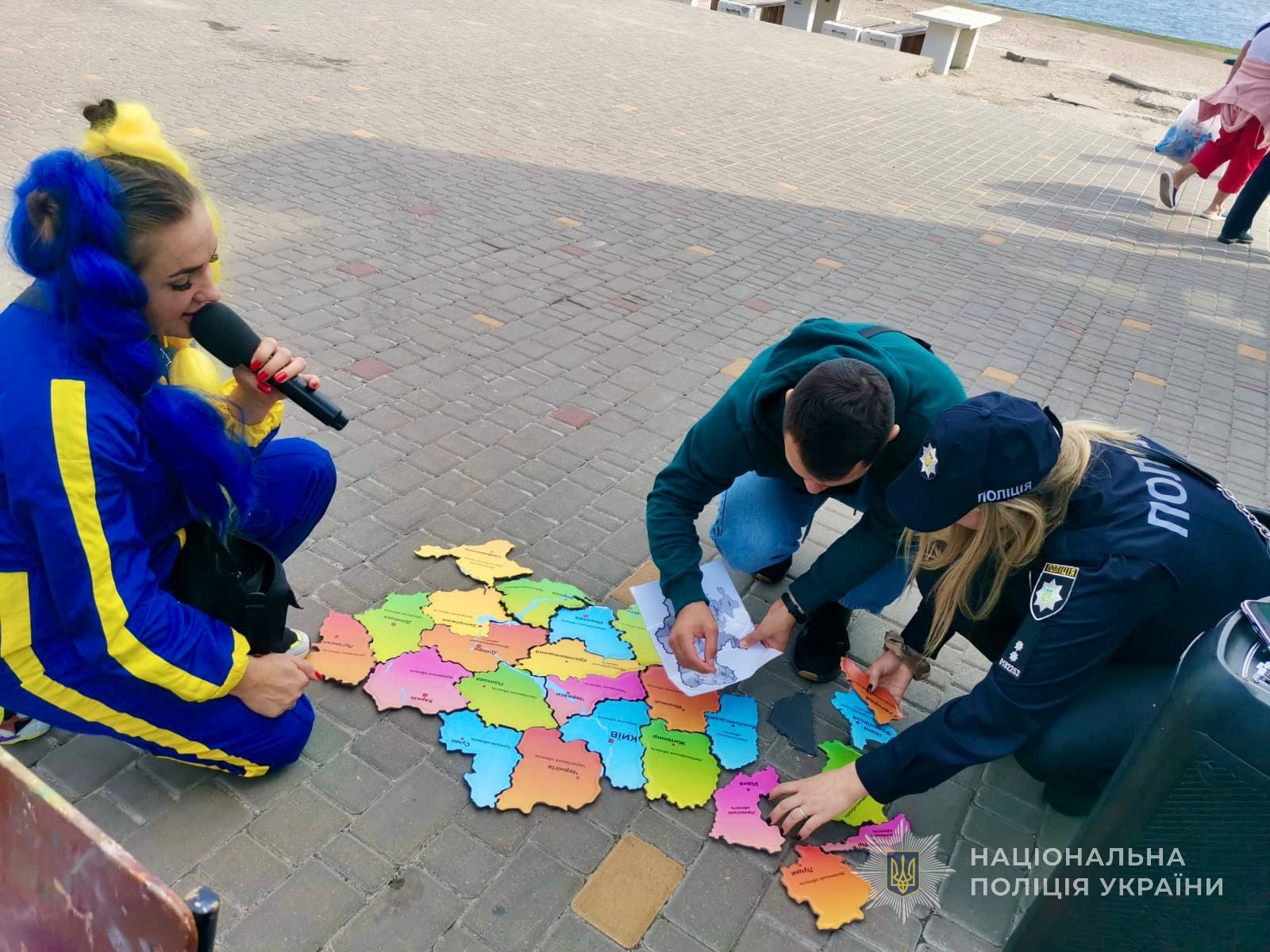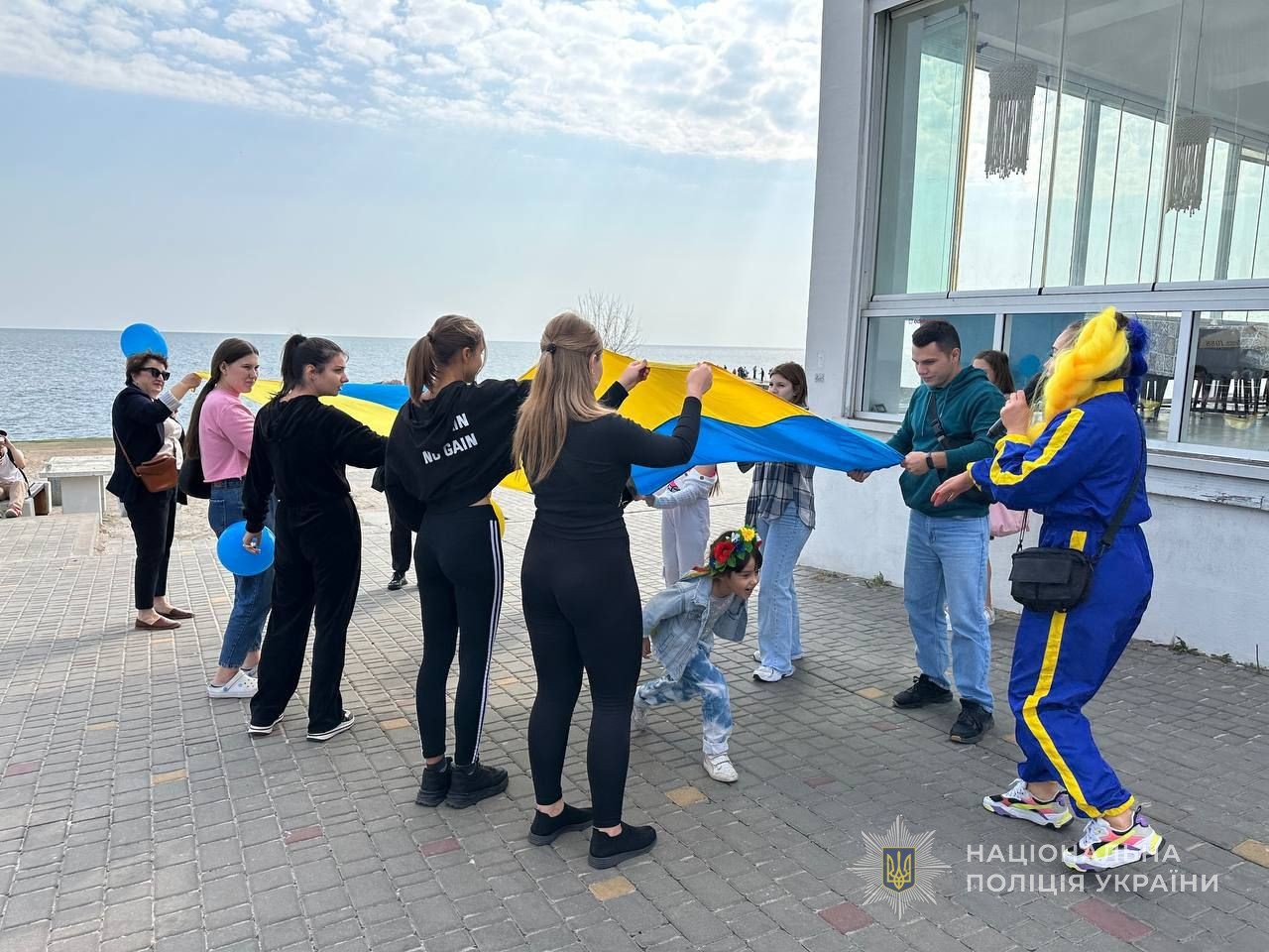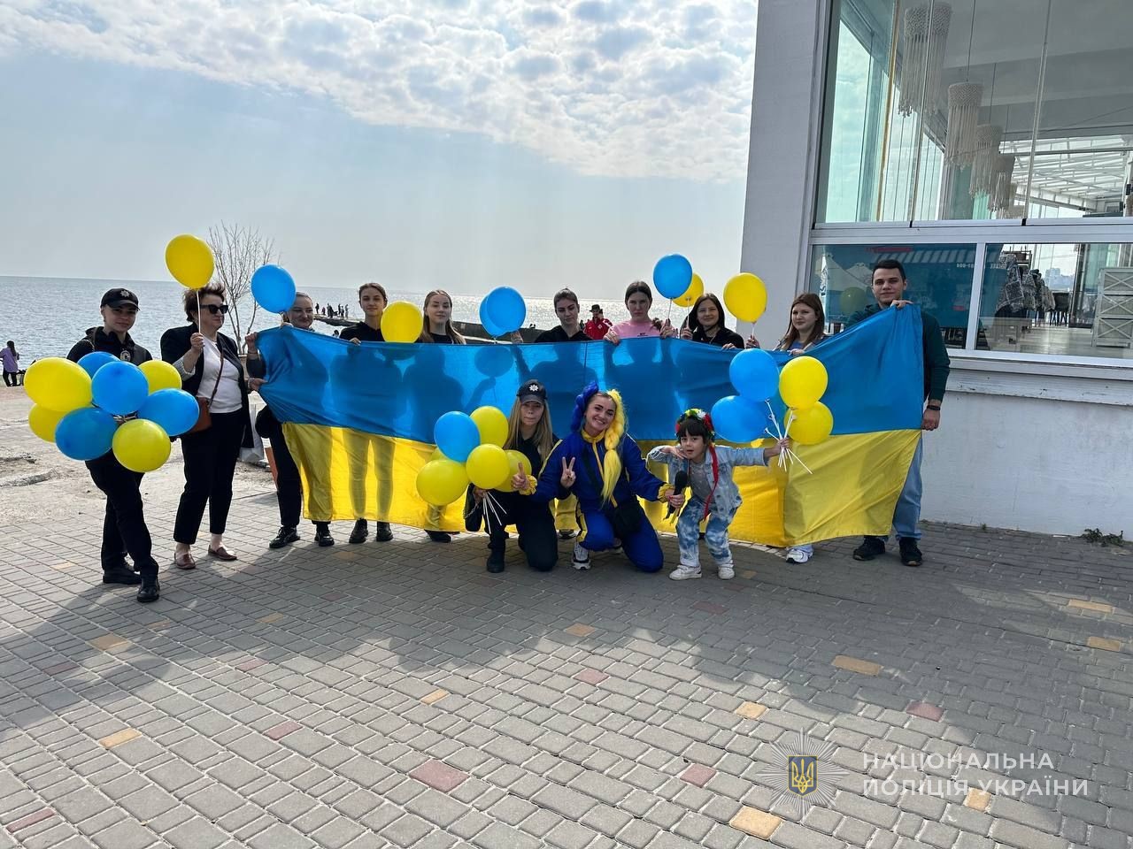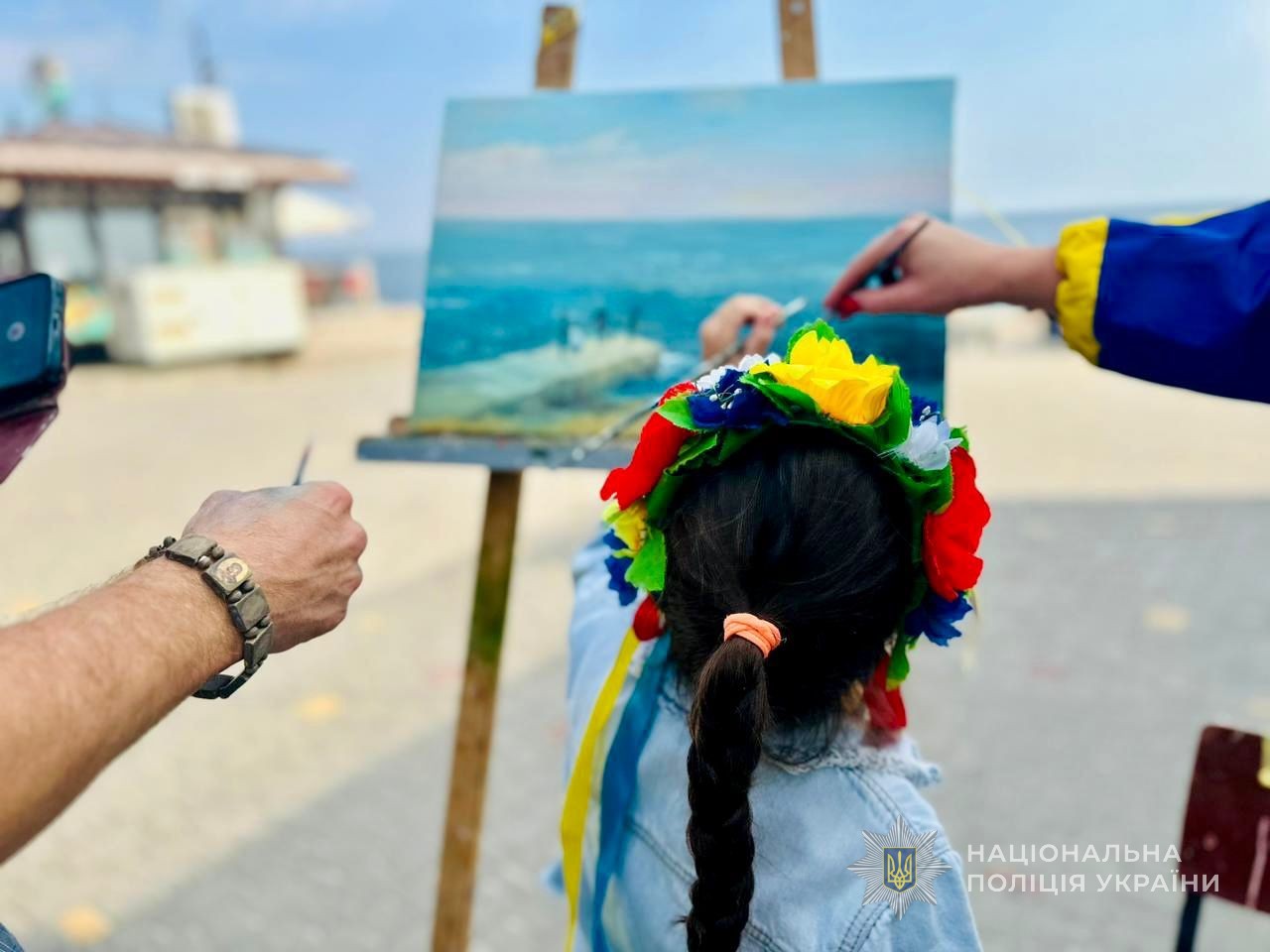 Аніматори зустріли молодь з розважальною програмою, правоохоронці потішили її патріотичними кульками та фотосесією зі стягом на фоні моря. А вже згодом юні одесити разом із запрошеним на зустріч місцевим художником відтворили красу узбережжя на полотні.
