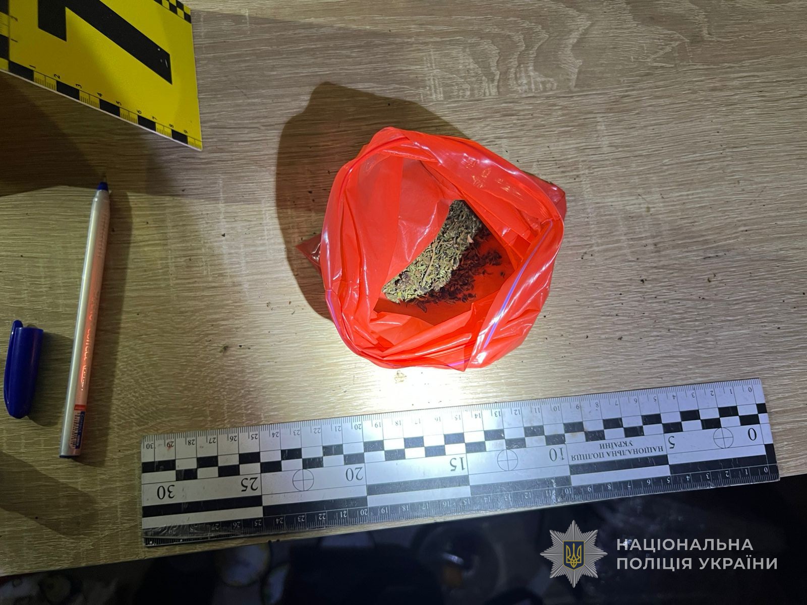 Під час обшуку в оселі ділка слідчі вилучили 13 пакетиків та 2 контейнери з речовинами рослинного походження, схожими на канабіс, пристрої для подрібнення наркотичних речовин і їх куріння із залишками та нашаруваннями, пакувальний матеріал, електронні ваги, мобільний телефон, гроші, а також предмет, зовні схожий на револьвер. Частину речових доказів скеровано на експертні дослідження.