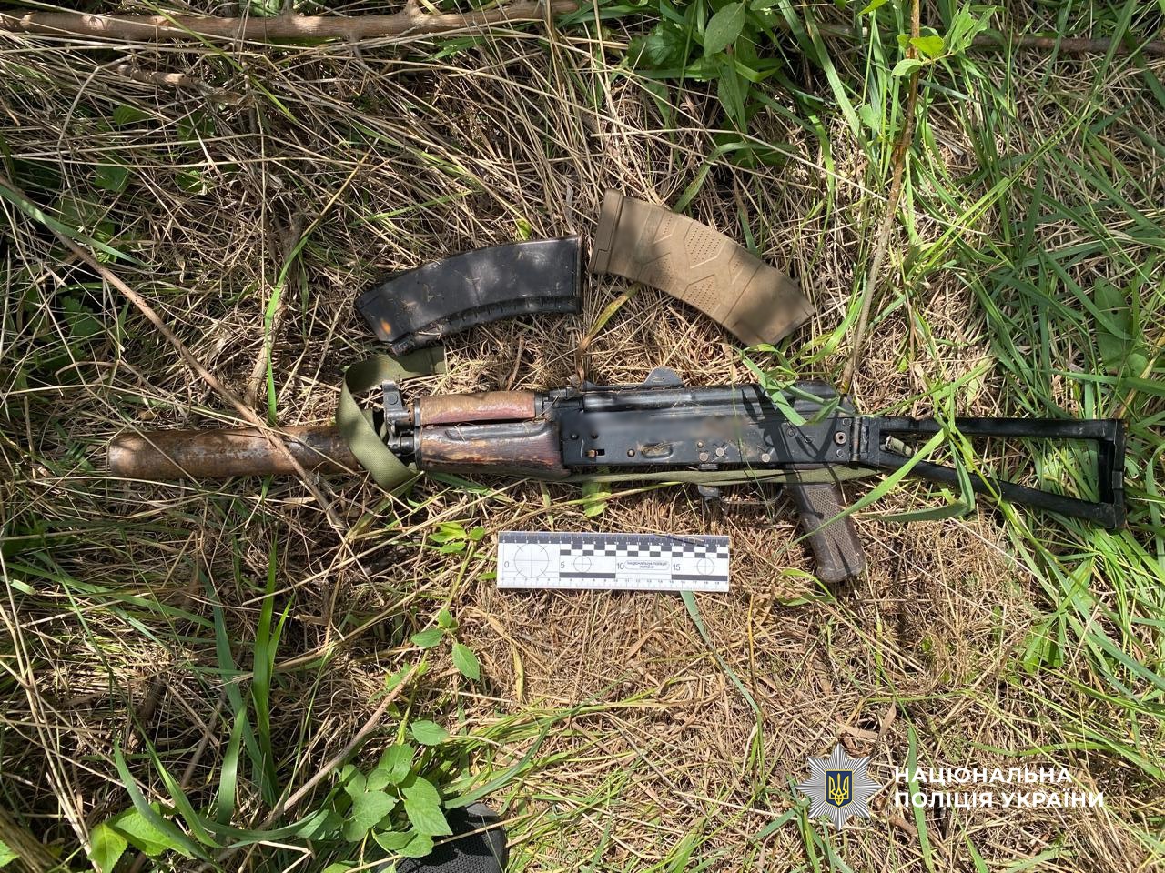На території домогосподарства правоохоронці виявили придатний для використання автомат Калашникова, що є нарізною вогнепальною зброєю. Він був захований у кущах позаду літньої кухні. Чоловік пояснив, що отримав його в подарунок від покійного брата, який нібито привіз трофейну зброю з зони бойових дій.
