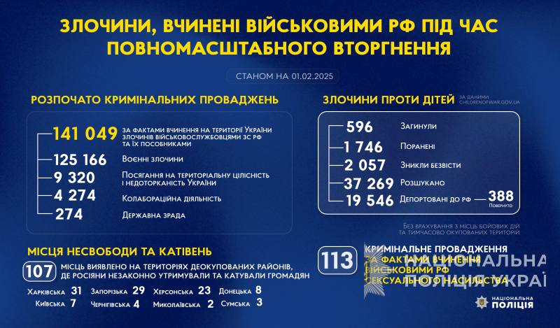 З початку повномасштабного вторгнення росії в Україну слідчі Національної поліції України розпочали 141 049 кримінальних проваджень за фактами вчинення на території України злочинів військовослужбовцями збройних сил російської федерації та їхніми пособниками.