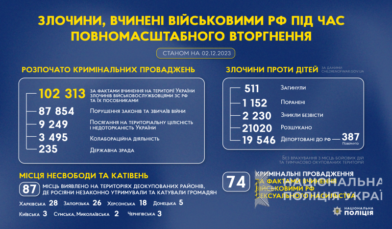 З початку повномасштабного вторгнення росії в Україну слідчі Національної поліції України розпочали 102 313 кримінальних проваджень за фактами вчинення на території України злочинів військовослужбовцями збройних сил російської федерації та їхніми пособниками.