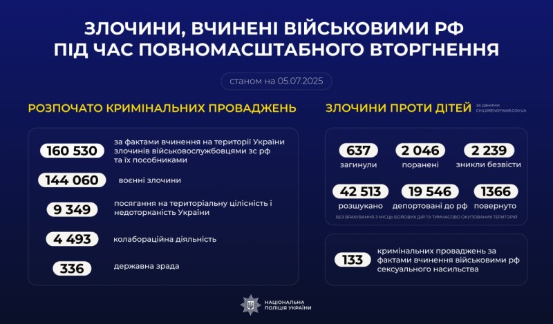 З початку повномасштабного вторгнення росії в Україну слідчі Національної поліції України розпочали 160 530 кримінальних проваджень за фактами вчинення на території України злочинів військовослужбовцями збройних сил російської федерації та їхніми пособниками.