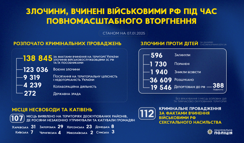 З початку повномасштабного вторгнення росії в Україну слідчі Національної поліції України розпочали 138 845 кримінальних проваджень за фактами вчинення на території України злочинів військовослужбовцями збройних сил російської федерації та їхніми пособниками.