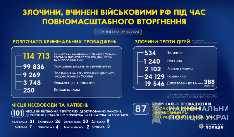 З початку повномасштабного вторгнення росії в Україну слідчі Національної поліції України розпочали 114 713 кримінальних проваджень за фактами вчинення на території України злочинів військовослужбовцями збройних сил російської федерації та їхніми пособниками.