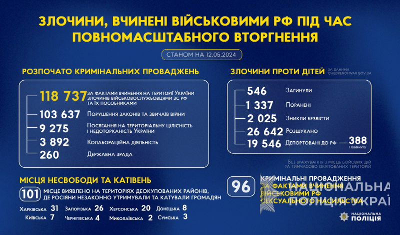 З початку повномасштабного вторгнення росії в Україну слідчі Національної поліції України розпочали 118 737 кримінальних проваджень за фактами вчинення на території України злочинів військовослужбовцями збройних сил російської федерації та їхніми пособниками.