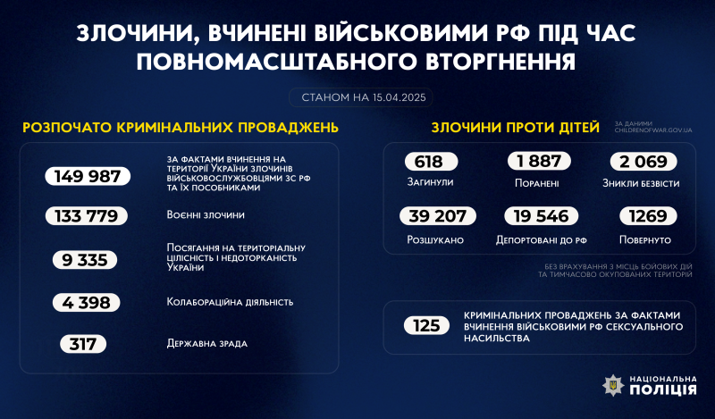 З початку повномасштабного вторгнення росії в Україну слідчі Національної поліції України розпочали 149 987 кримінальних проваджень за фактами вчинення на території України злочинів військовослужбовцями збройних сил російської федерації та їхніми пособниками.