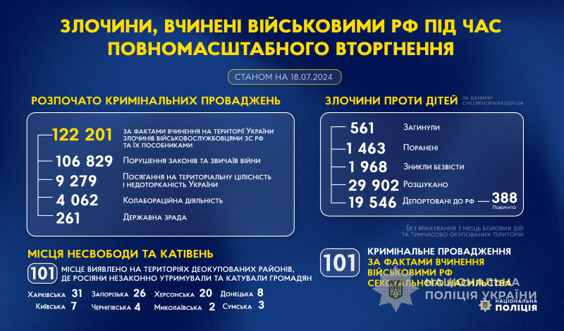 З початку повномасштабного вторгнення росії в Україну слідчі Національної поліції України розпочали 122 201 кримінальних проваджень за фактами вчинення на території України злочинів військовослужбовцями збройних сил російської федерації та їхніми пособниками.