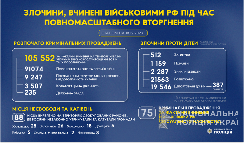 З початку повномасштабного вторгнення росії в Україну слідчі Національної поліції України розпочали 105 552 кримінальних проваджень за фактами вчинення на території України злочинів військовослужбовцями збройних сил російської федерації та їхніми пособниками.