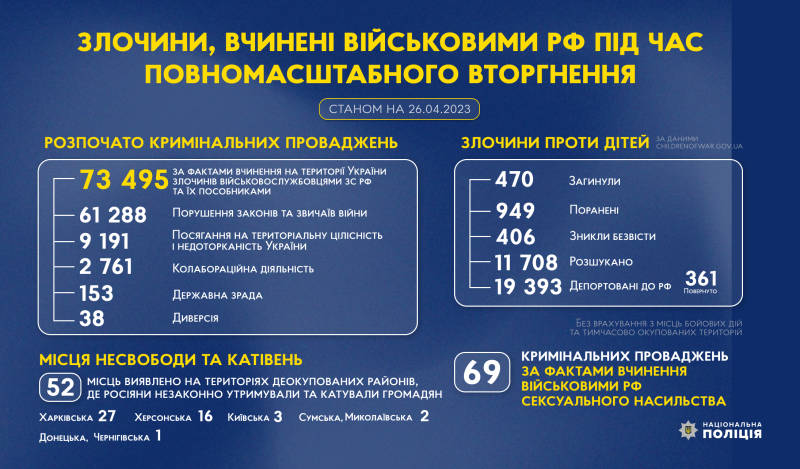 З початку повномасштабного вторгнення росії в Україну слідчі Національної поліції України розпочали 73 495 кримінальних проваджень за фактами вчинення на території України злочинів військовослужбовцями збройних сил російської федерації та їхніми пособниками.