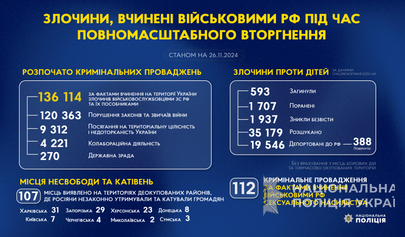 З початку повномасштабного вторгнення росії в Україну слідчі Національної поліції України розпочали 136 114 кримінальних проваджень за фактами вчинення на території України злочинів військовослужбовцями збройних сил російської федерації та їхніми пособниками.