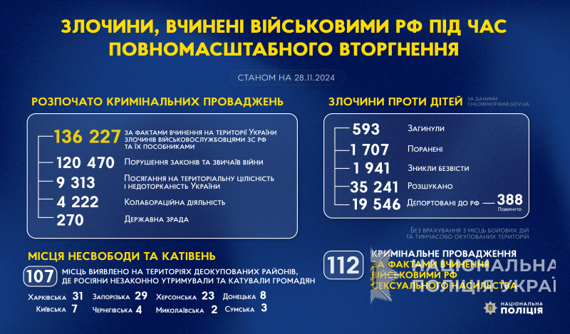 З початку повномасштабного вторгнення росії в Україну слідчі Національної поліції України розпочали 136 227 кримінальних проваджень за фактами вчинення на території України злочинів військовослужбовцями збройних сил російської федерації та їхніми пособниками.